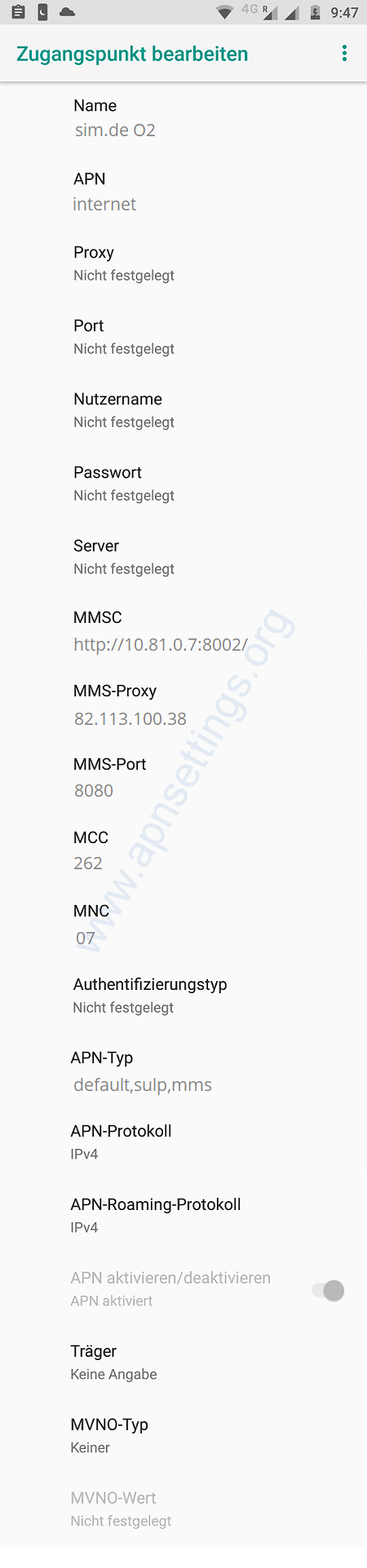 sim.de APN-Einstellungen für Android (O2-Netz)
